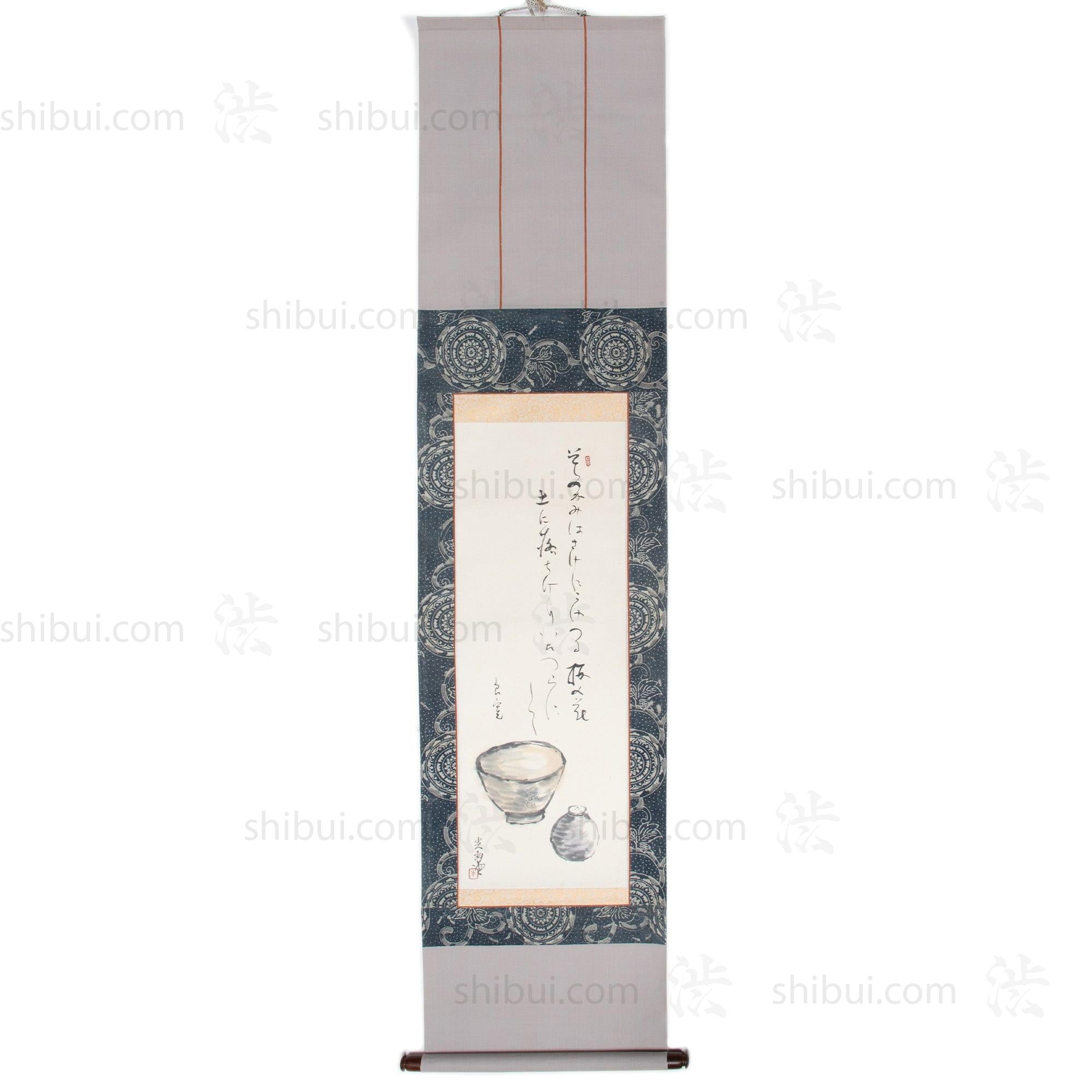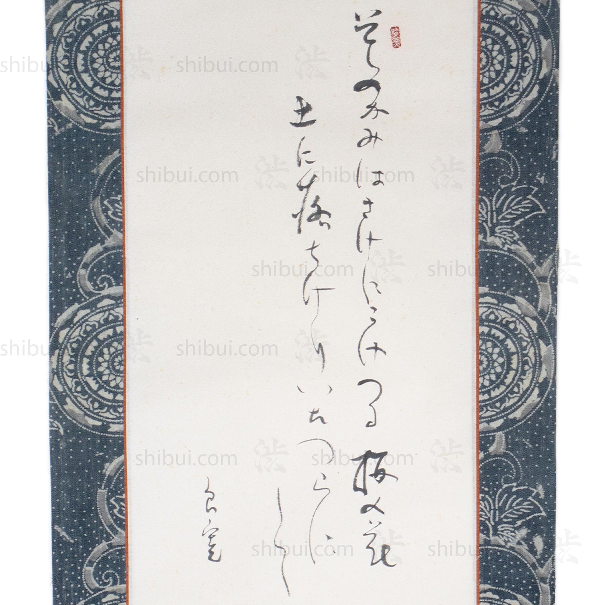An antique Japanese hanging wall scroll that features a famous haiku by the Zen Buddhist & poet, Ryokan. When Ryokan visited the house of his old friend, Harada Kasai (1763-1827), he found that Kasai had moved and what was left was an empty lot with a solitary plum tree sitting in it. In the past the two of them would float falling plum petals in their sake, compose waka poetry, and enjoy the arts. A monument to this poem has been erected at Kasai's old home in Magiyama, Niigata Prefecuture.