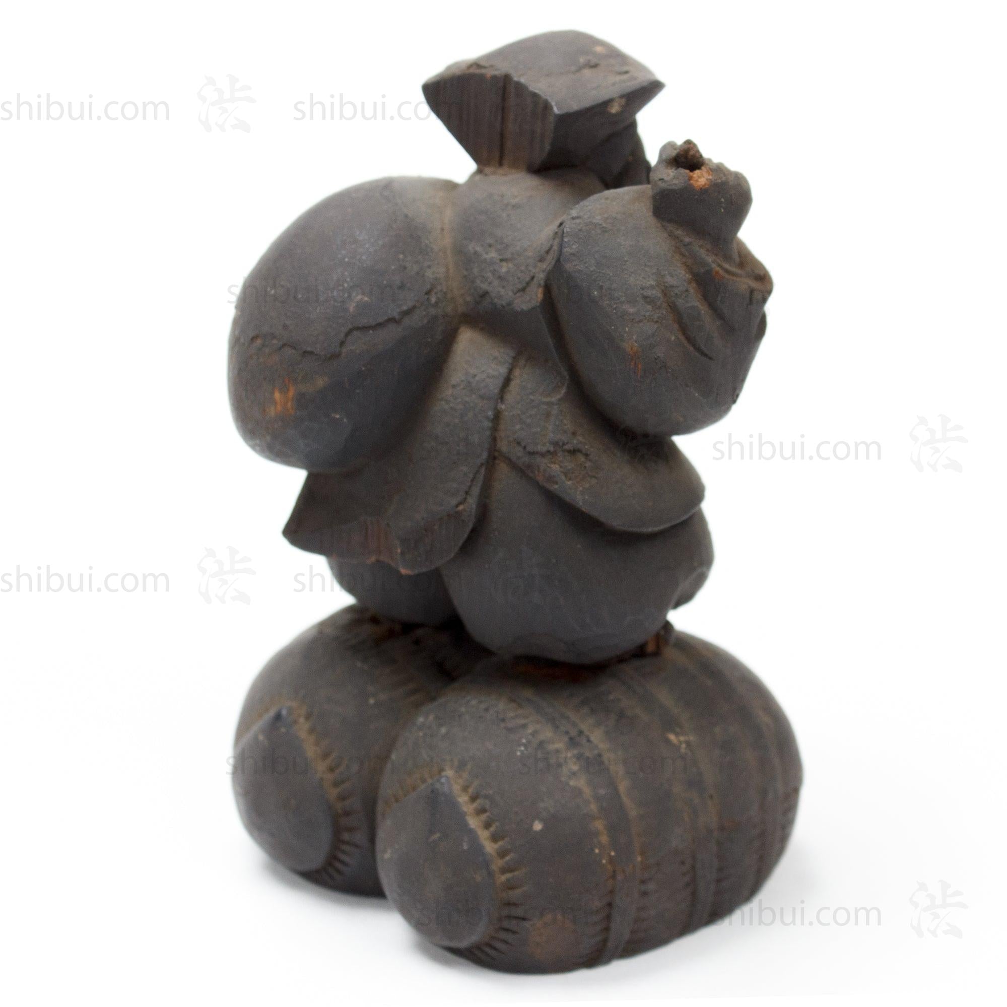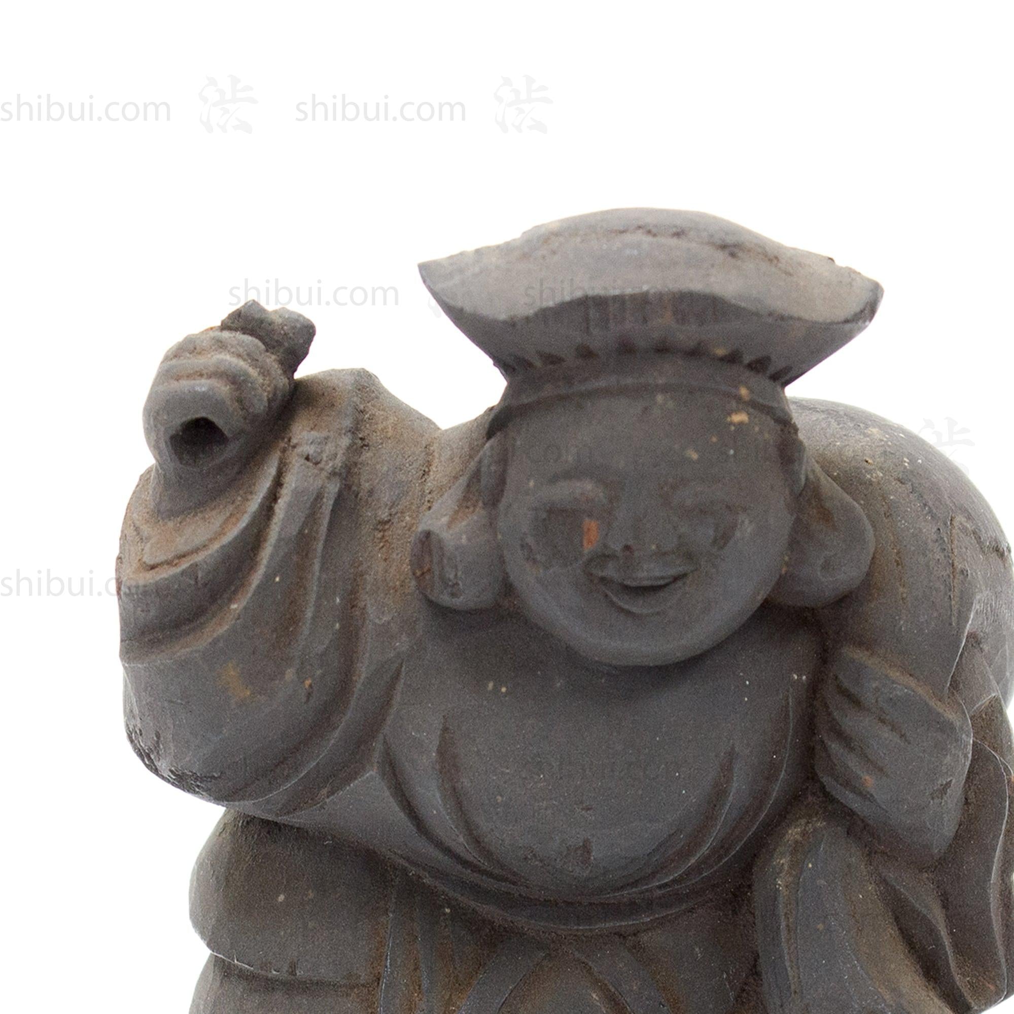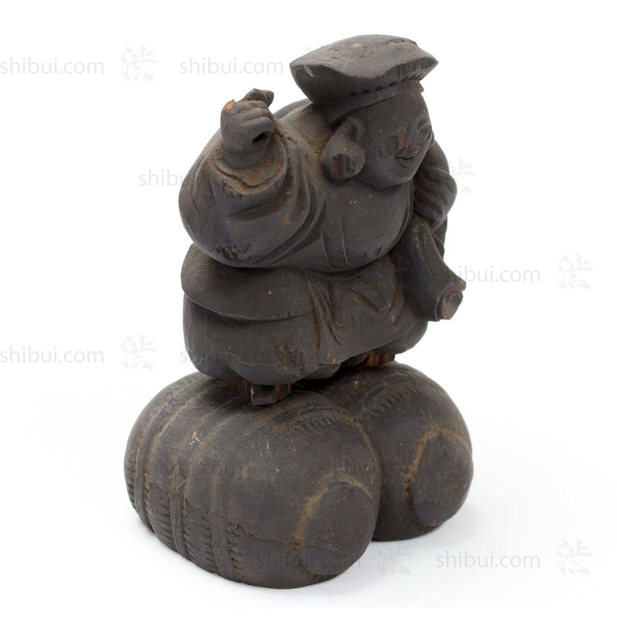 Hand-carved Daikoku, one of the Shichifukujin (Seven Lucky Gods). Often depicted with Ebisu, as they are considered symbols of prosperity and good fortune. Daikoku, the God of Wealth and Harvest, usually wears a black hat and stands on a bale of rice. He carries a large sack full of treasure and holds a small magic mallet.
