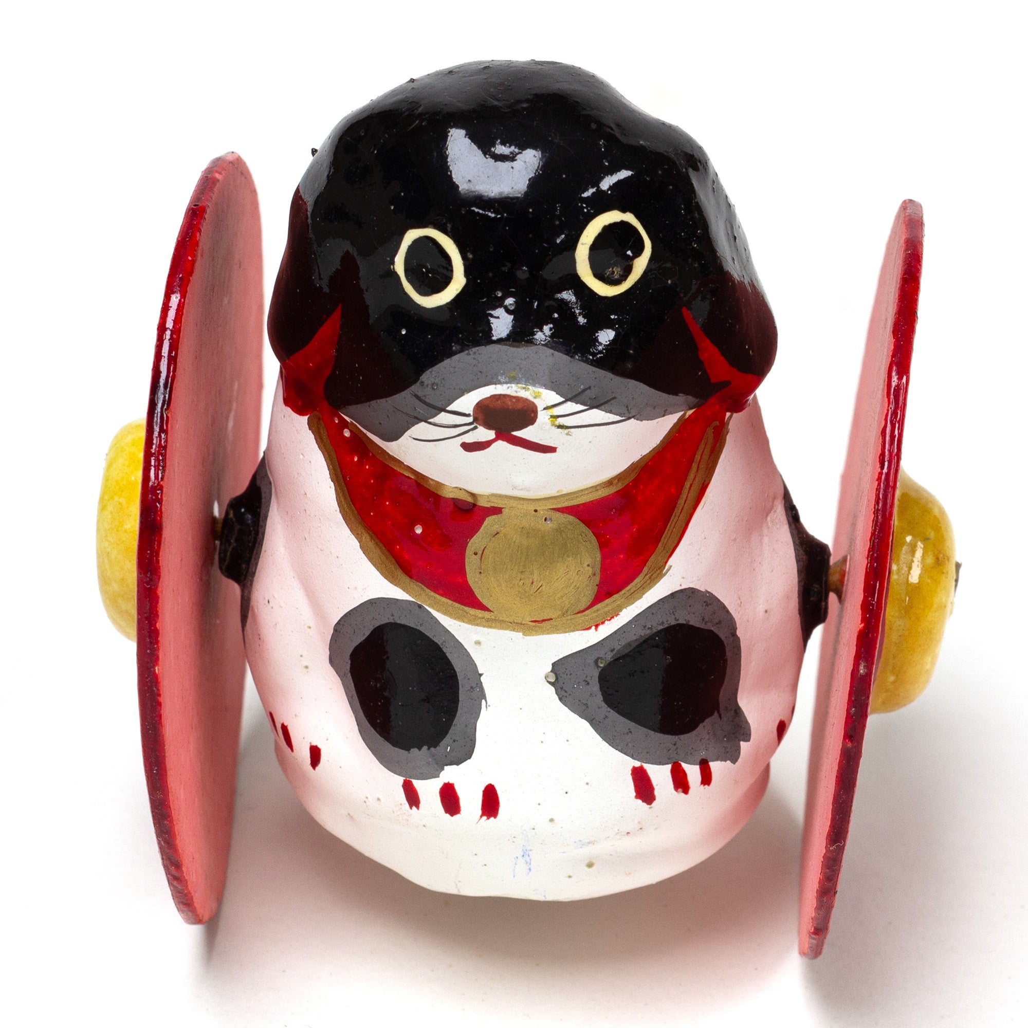 A toy dog that bobs as it rolls along the floor or table. This style of toy originated in Hamamatsu, Shizuoka Prefecture from a former samurai who would make them from his waste calligraphy paper for the local children. His designs have been passed down through his family since the Meiji Era.