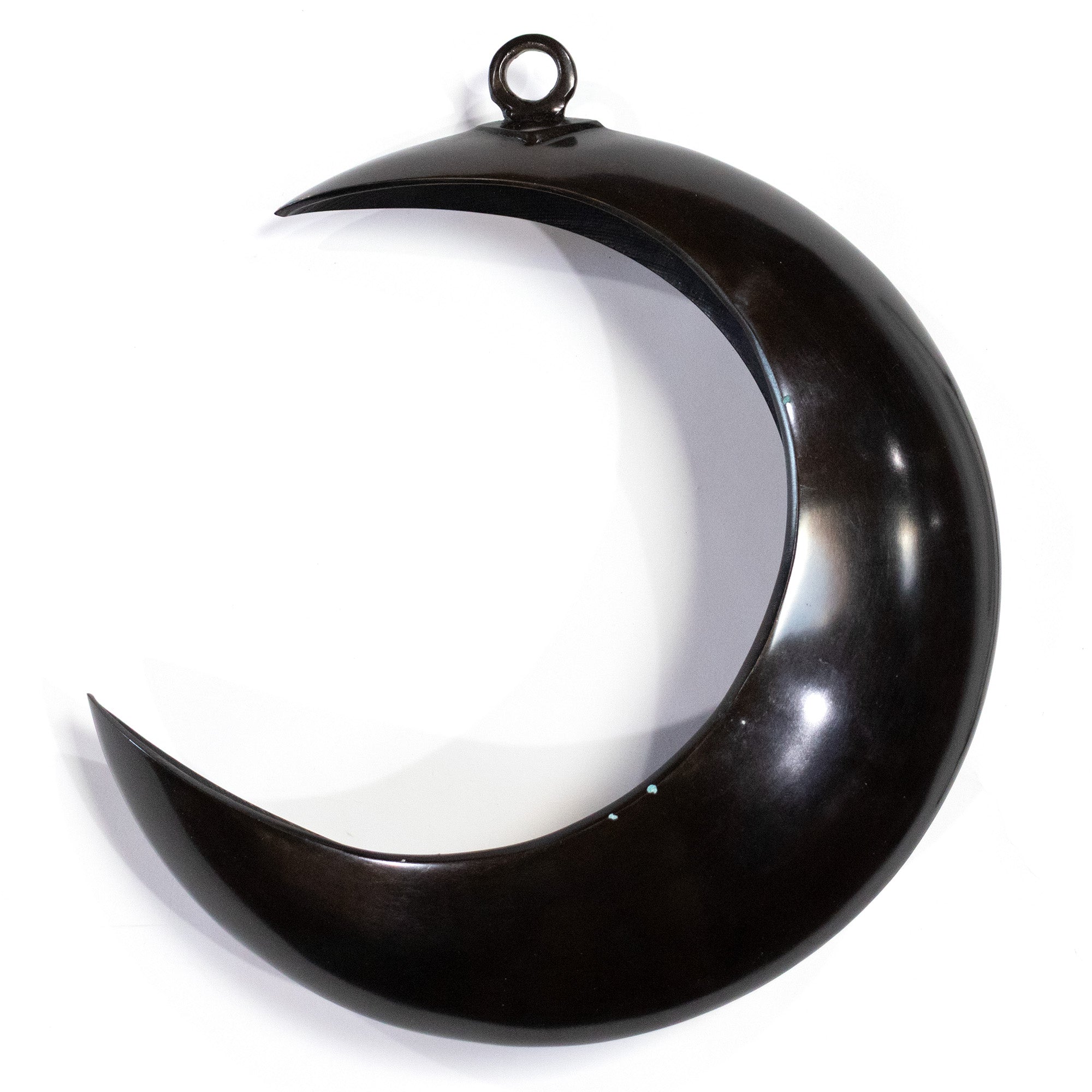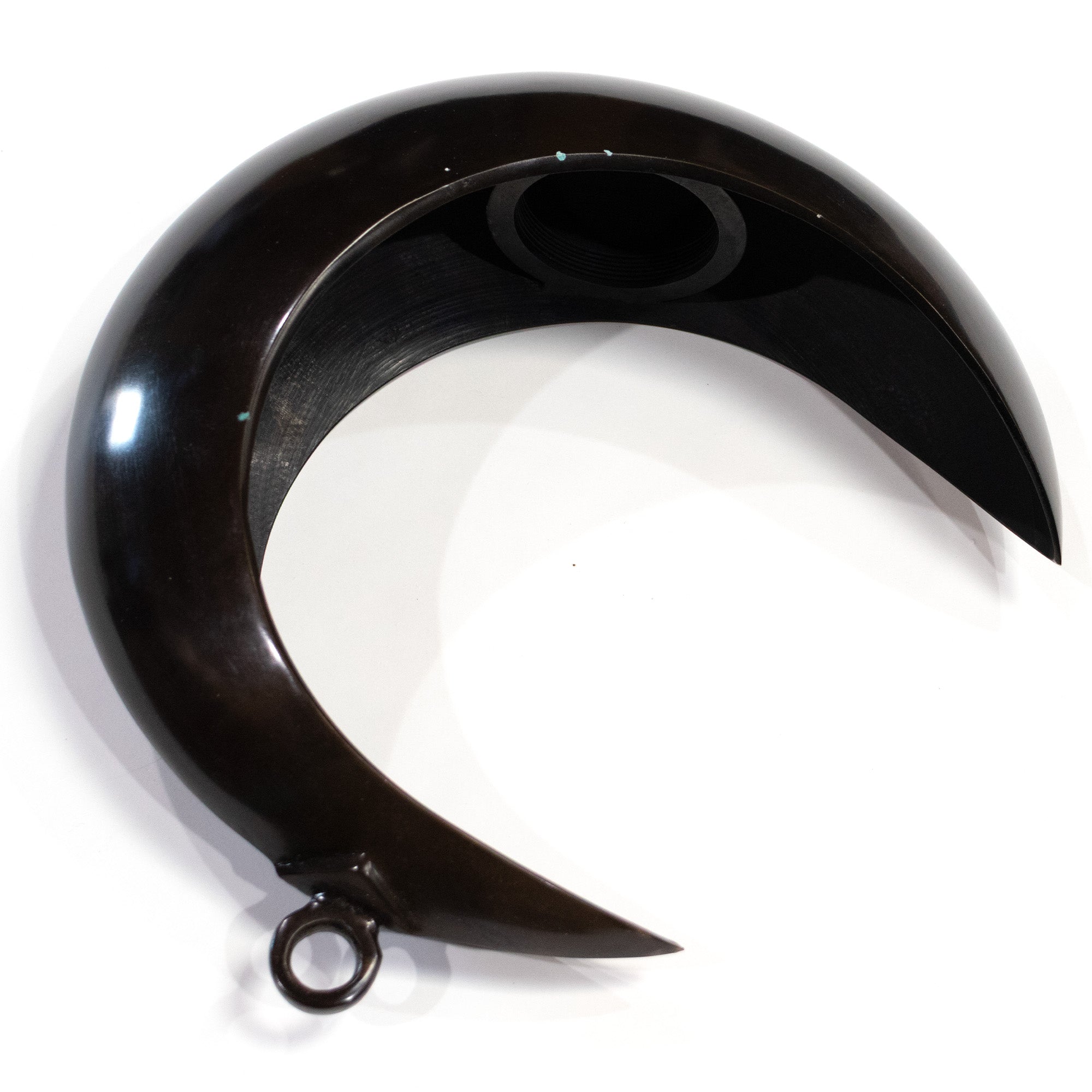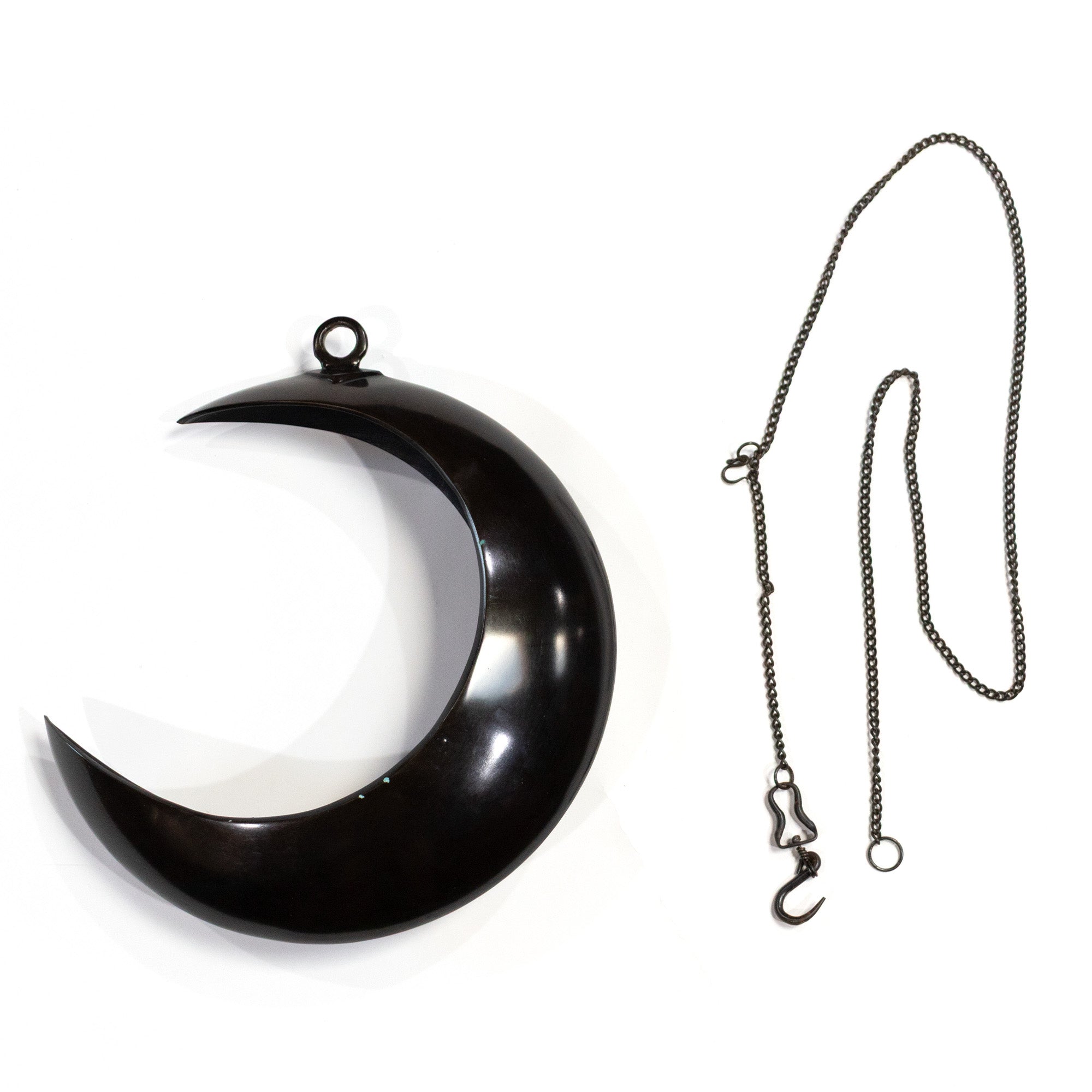 This hanging vase has been artistically crafted to resemble a crescent moon. It comes with a chain to hang it.