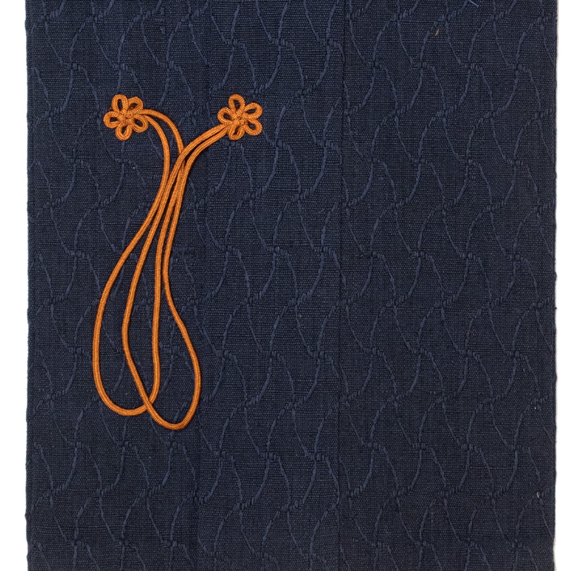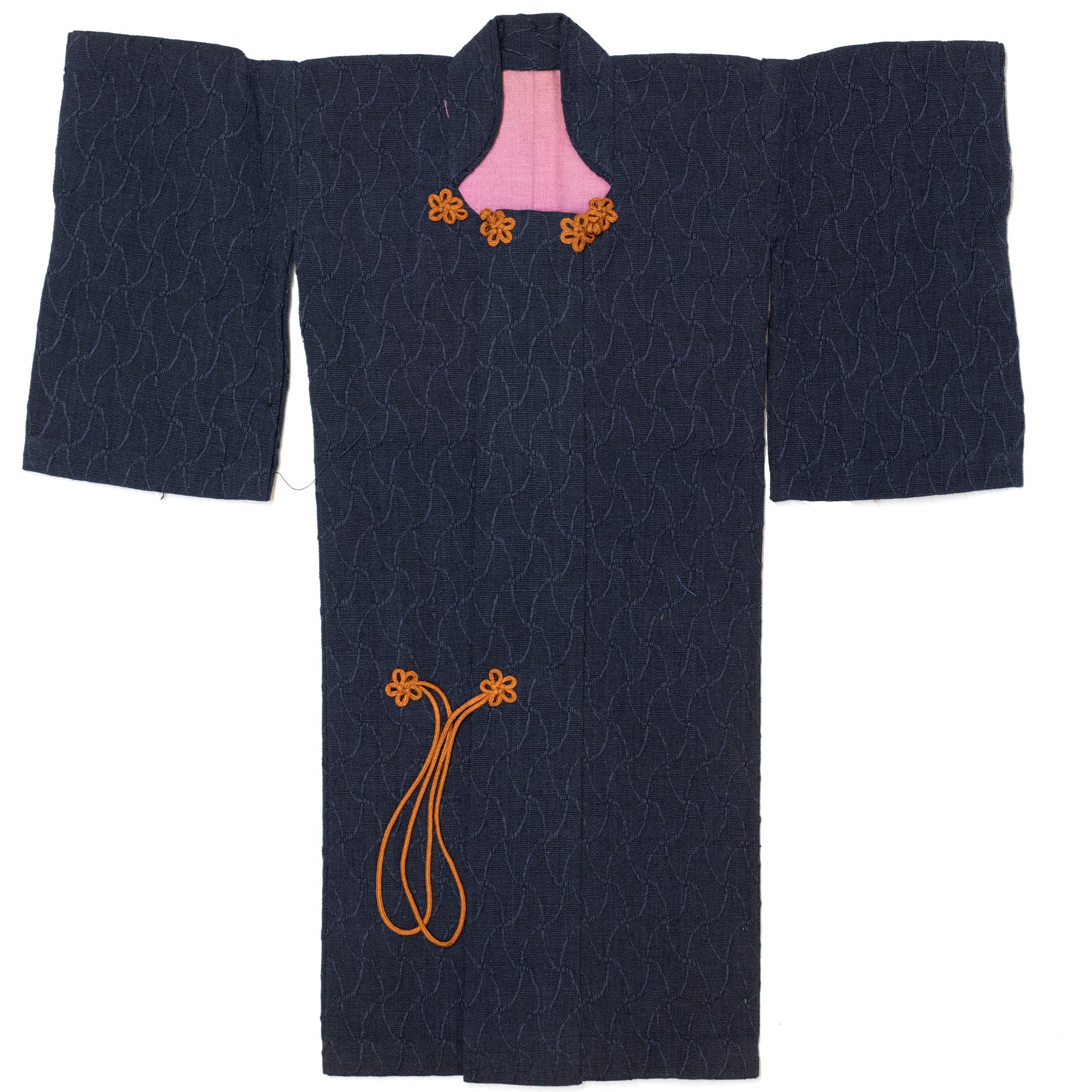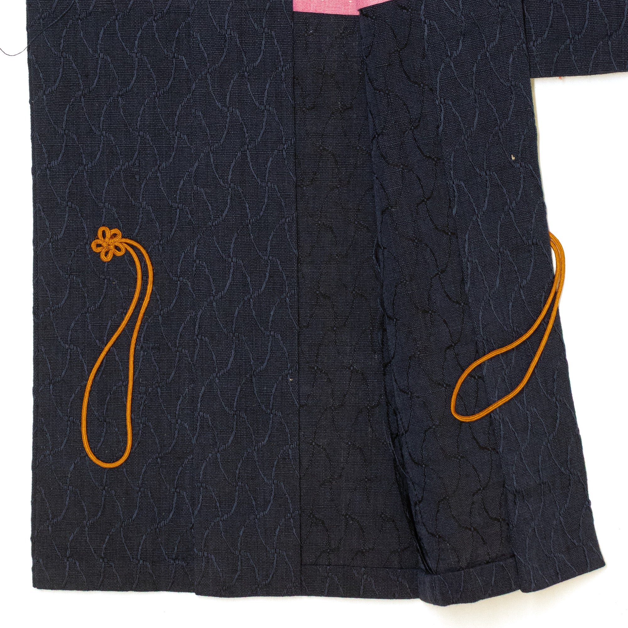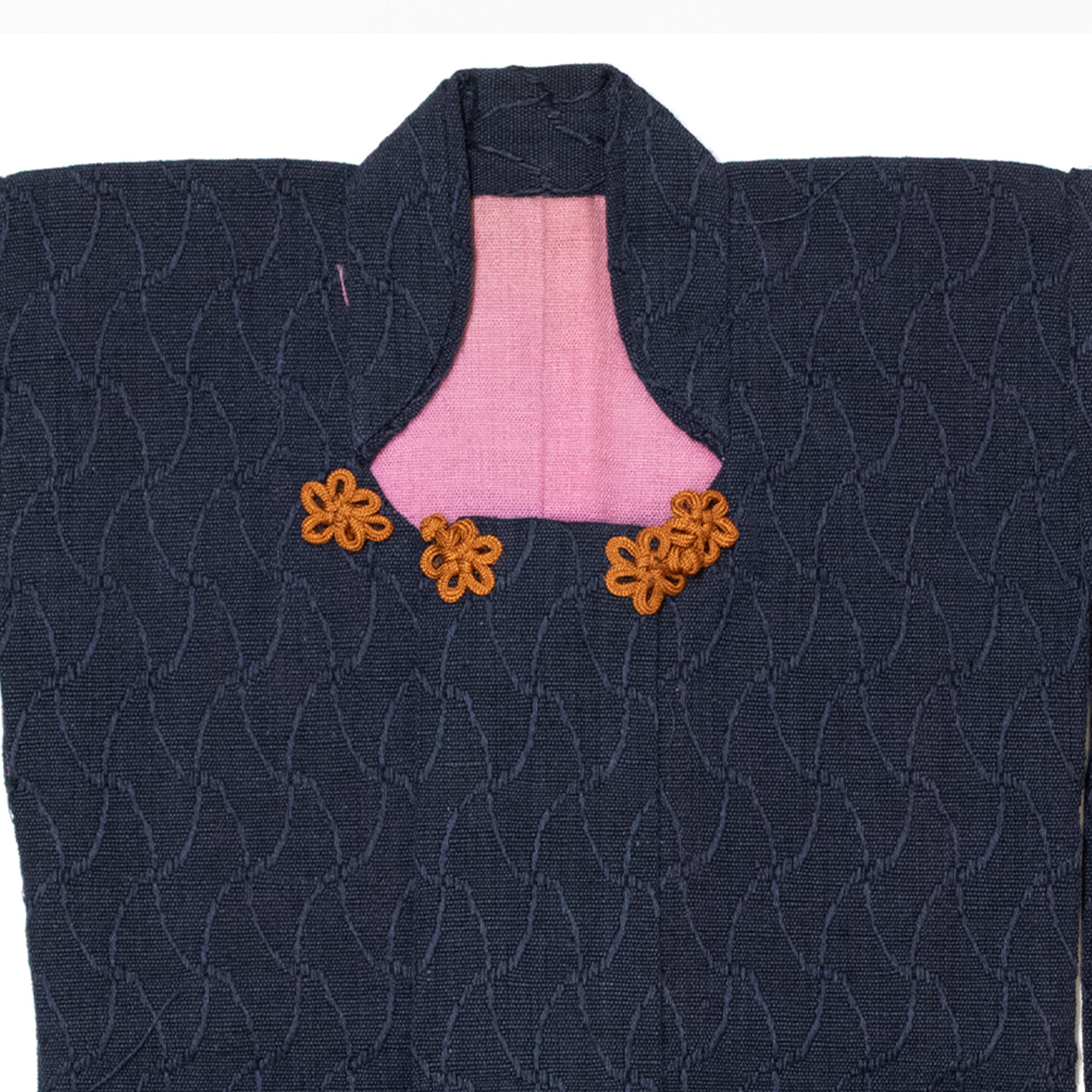 Japanese sewing sample maquette of a douchugi traveling coat. Japanese Sewing samples are made so young women and other sewing beginners can practice cutting and sewing the intricacies of Japanese textiles without wasting large amounts of fabric.