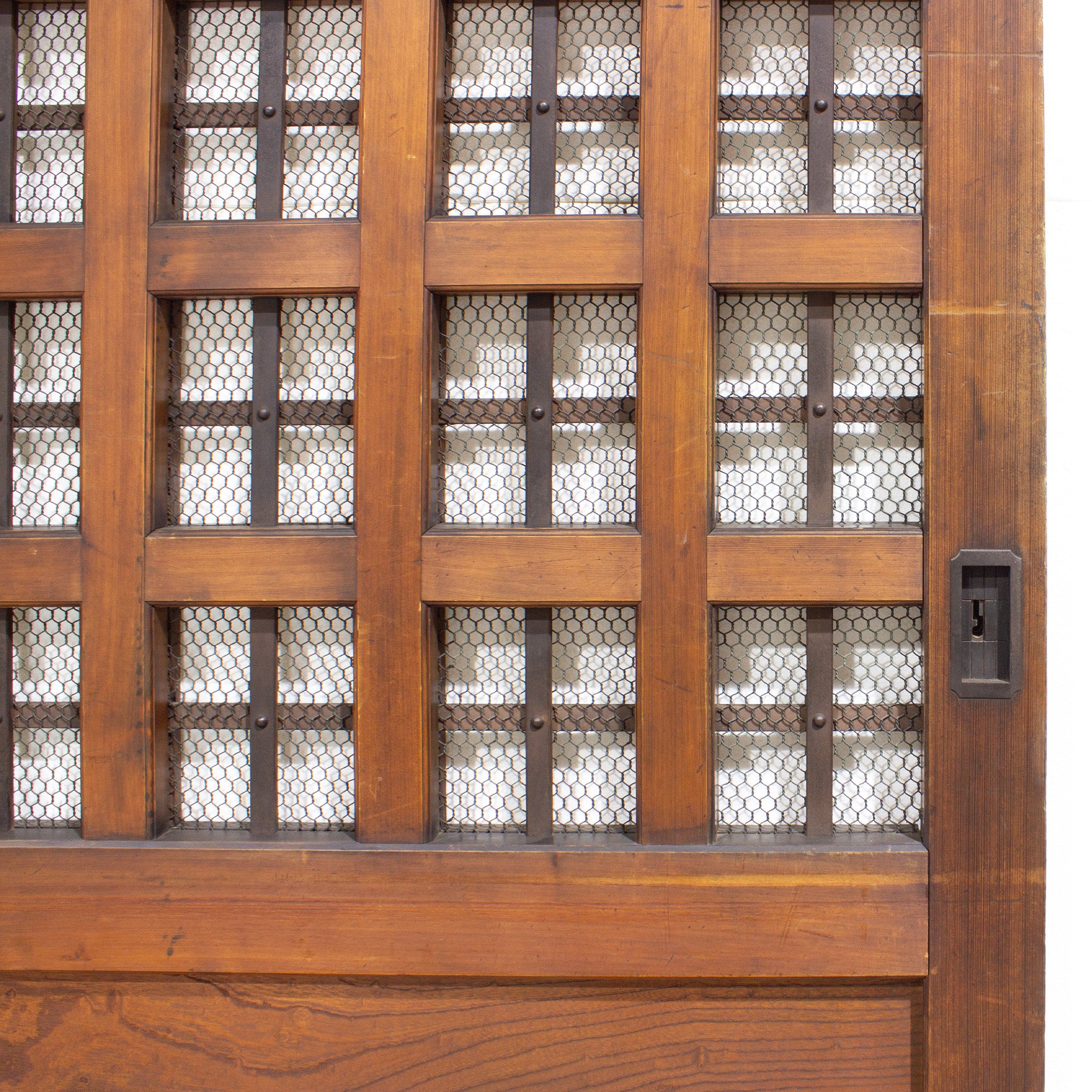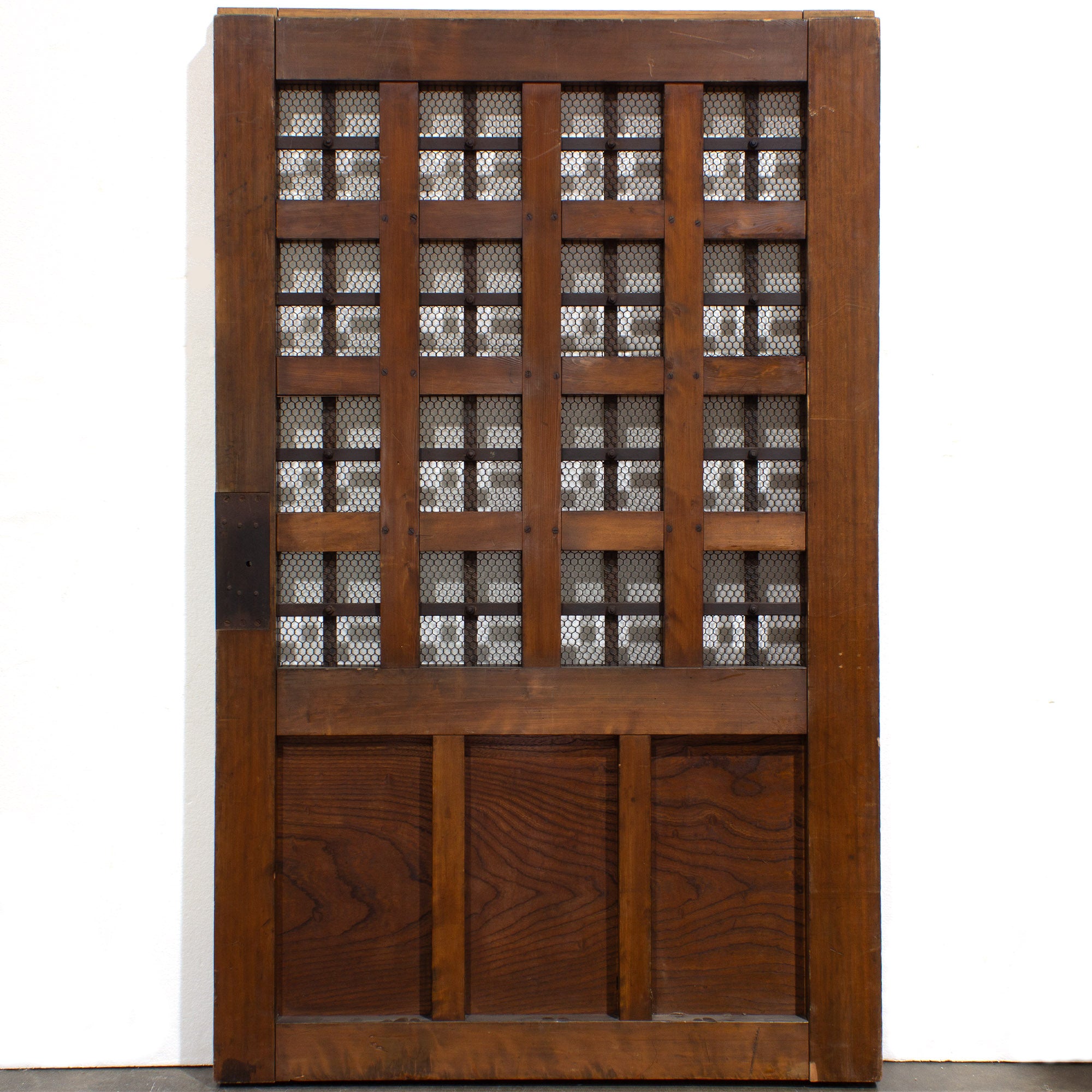 Summer kura (storehouse) door with beautiful ironwork over beautifully figured Keyaki panel with hinoki wood frame and lattice.