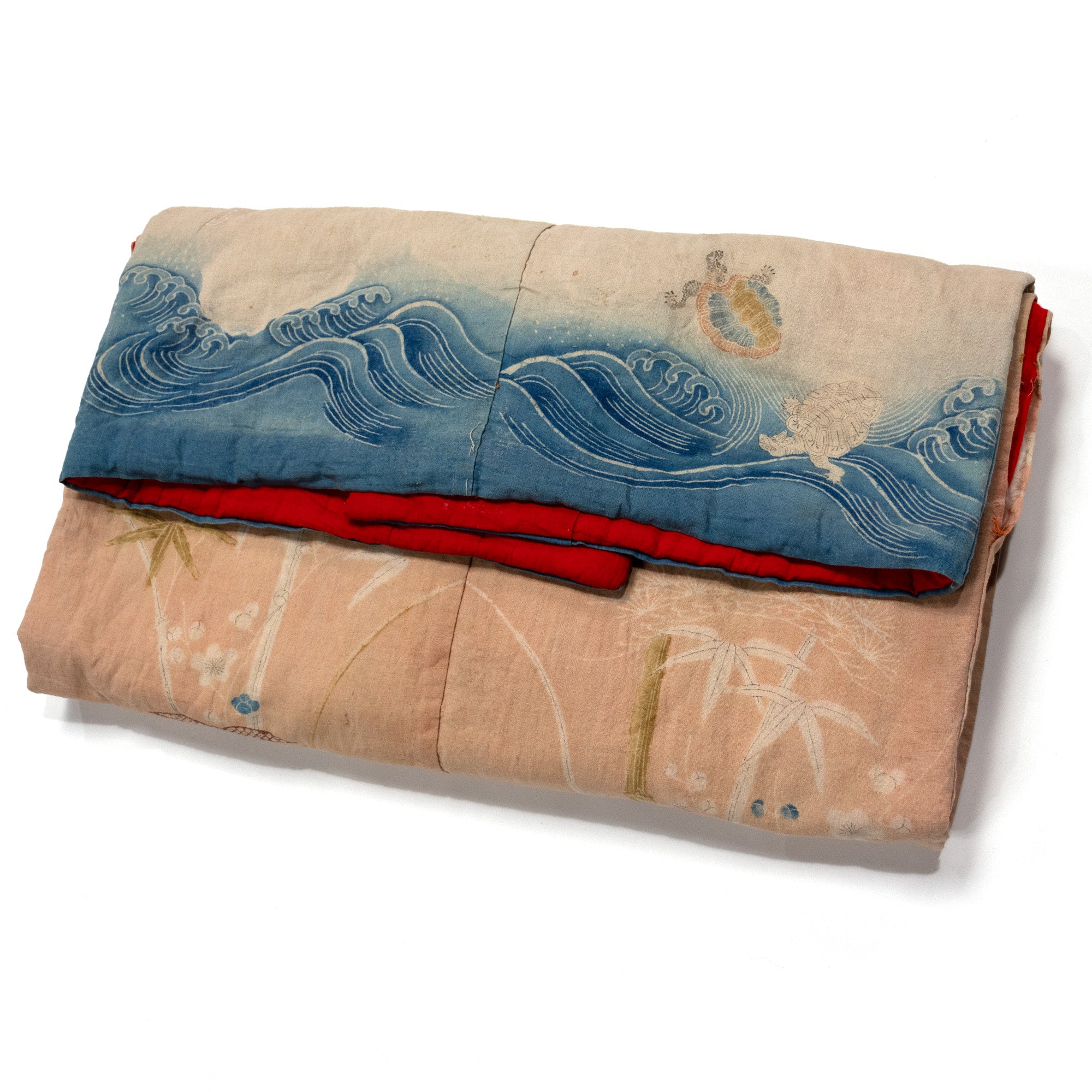Wonderful hand-sewn silk child's kimono. Bokashi ぼかし染め (hombre dying technique) over handwoven cotton with painted imagery of crane, pine, and tortoise. Features a red lining. This style of kimono is very unusual to see in cotton. Please see photos for details; condition consistent with age.