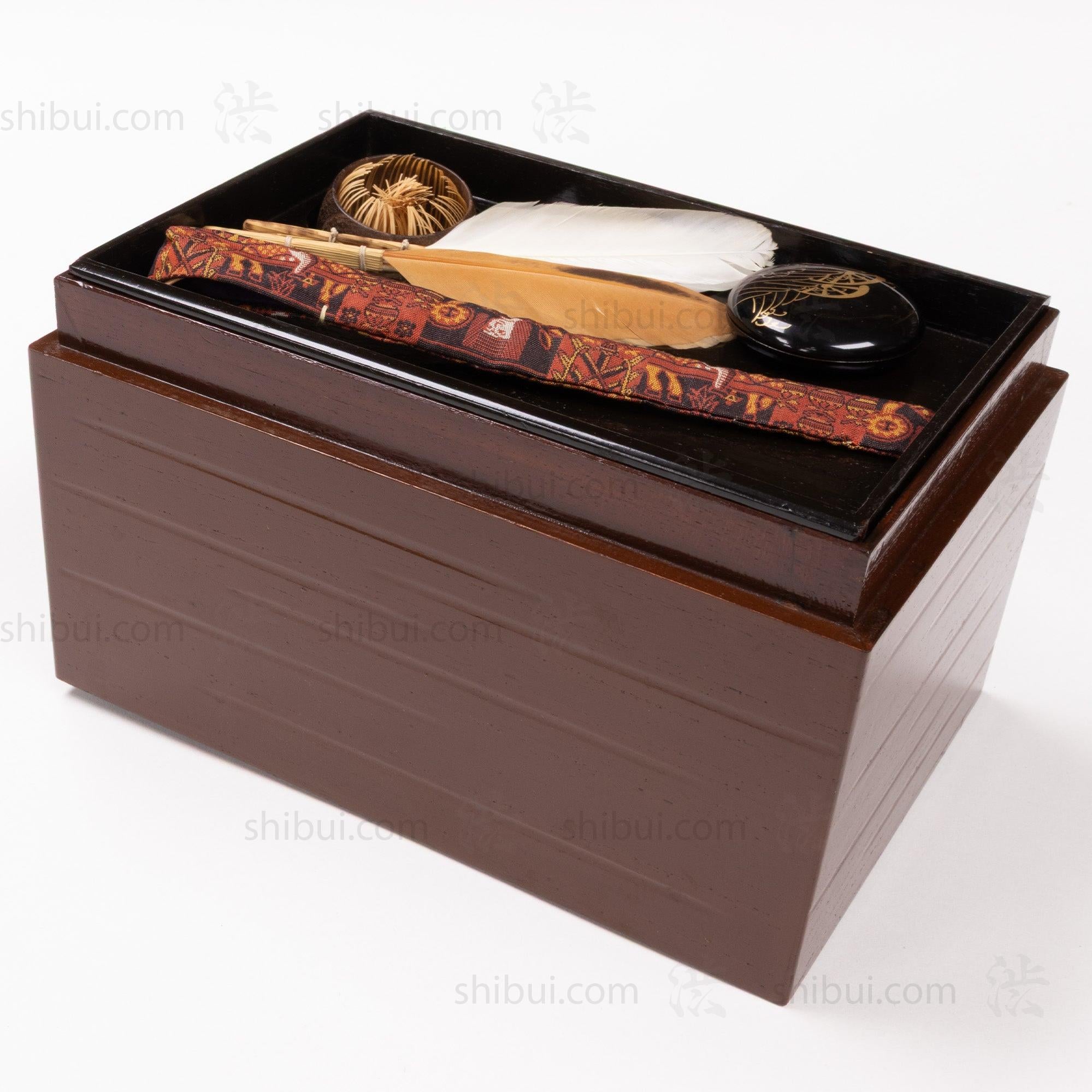 Travelling tea set. Includes a whisk with a case, folding chashaku, lacquered natsume, Karatsu tea bowl, a lacquered kogo, two feather fans, a sweets jar, a woven basket with a cinching top, and a carrying box.