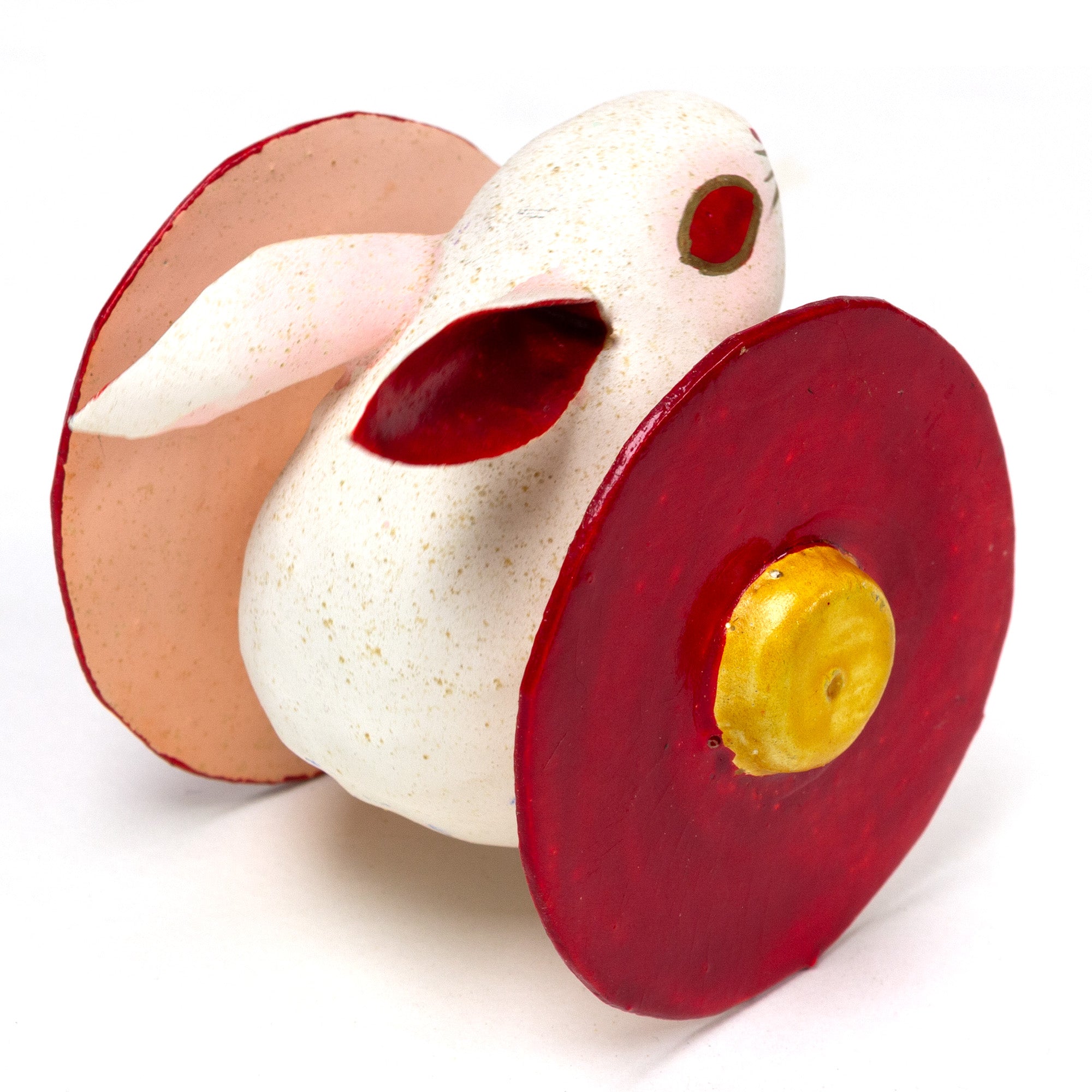 A toy rabbit that bobs as it rolls along the floor or table. This style of toy originated in Hamamatsu, Shizuoka Prefecture from a former samurai who would make them from his waste calligraphy paper for the local children. His designs have been passed down through his family since the Meiji Era.