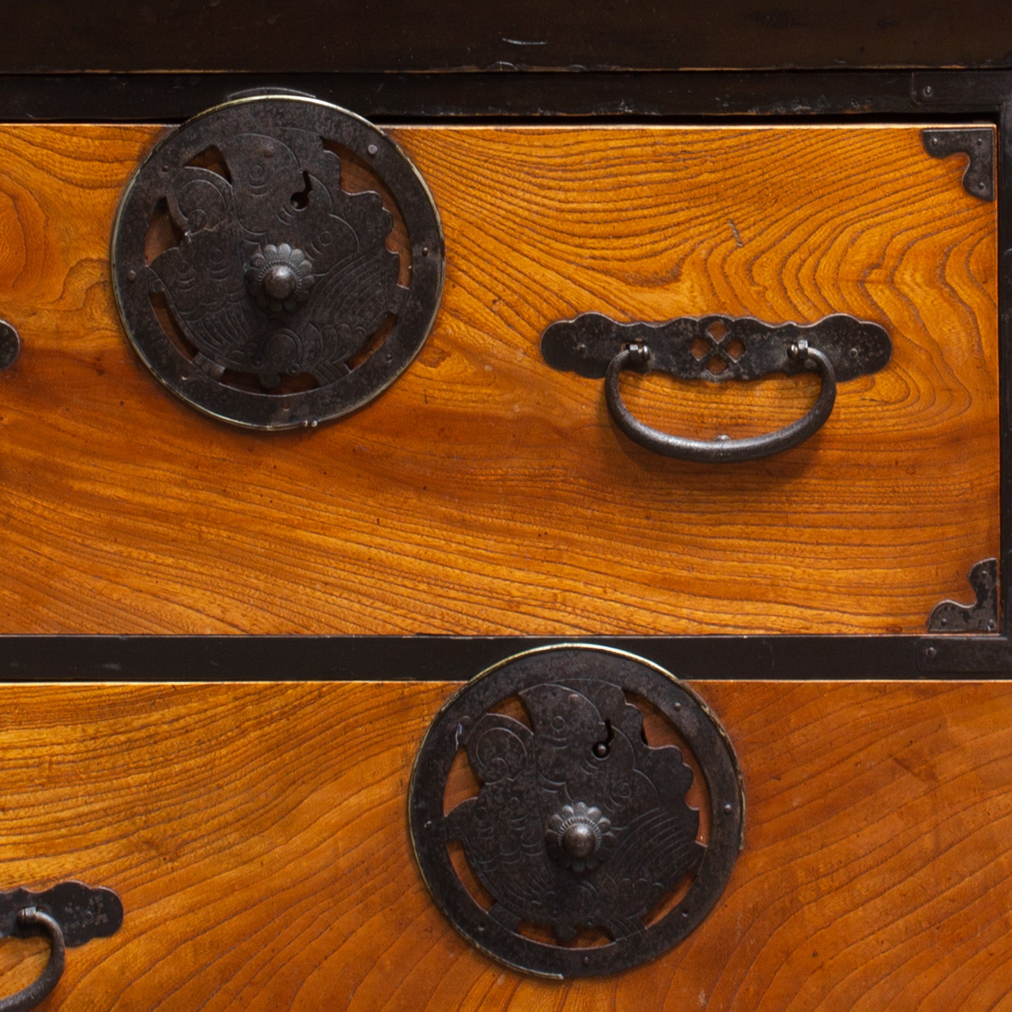 Isho dansu (clothing chest) in two sections from Yonezawa City, Yamagata Prefecture, Japan. Keyaki wood face and Sugi wood case and drawer interiors with hand forged, pierced and chased iron hardware distinctive to Yonezawa.